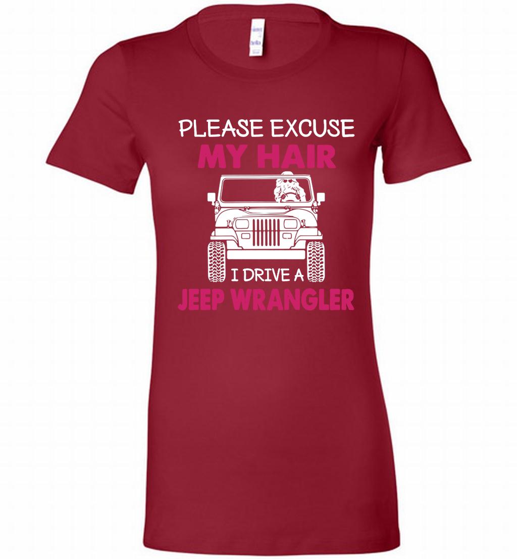 Please Excuse My Hair I Drive A Jeep Wrangler Bella Ladies Tee 100% Cotton, 4.3oz - Made In USA